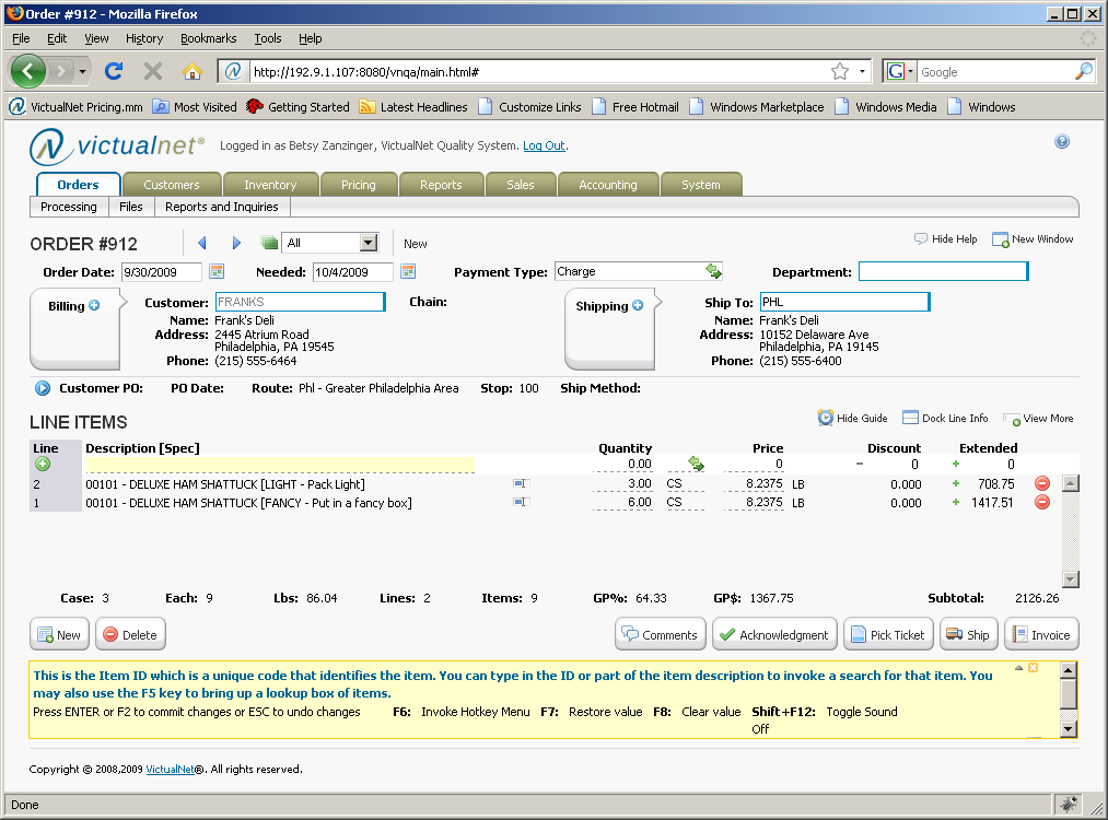 Note that you can put different specifications for the same item on one order, and that the spec description now shows behind the item description on the order line item screen.