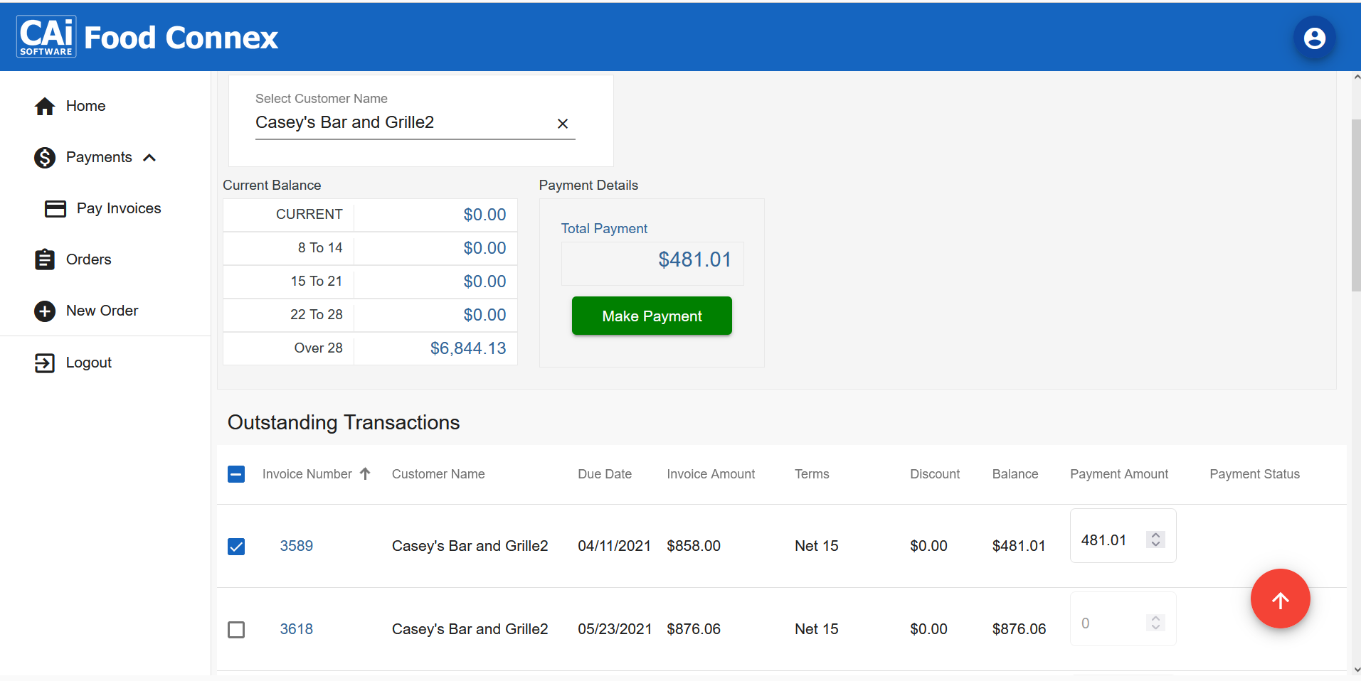 When the invoices are selected the user clicks the Make Payment button.