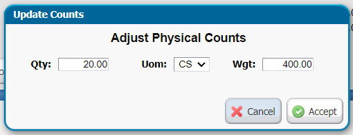Quantity and Weight will default to current stock, can be overridden with updated counts.