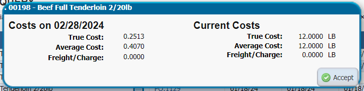 Clicking the cost column will display the historical and current costs for the item (based on user's role permissions.)